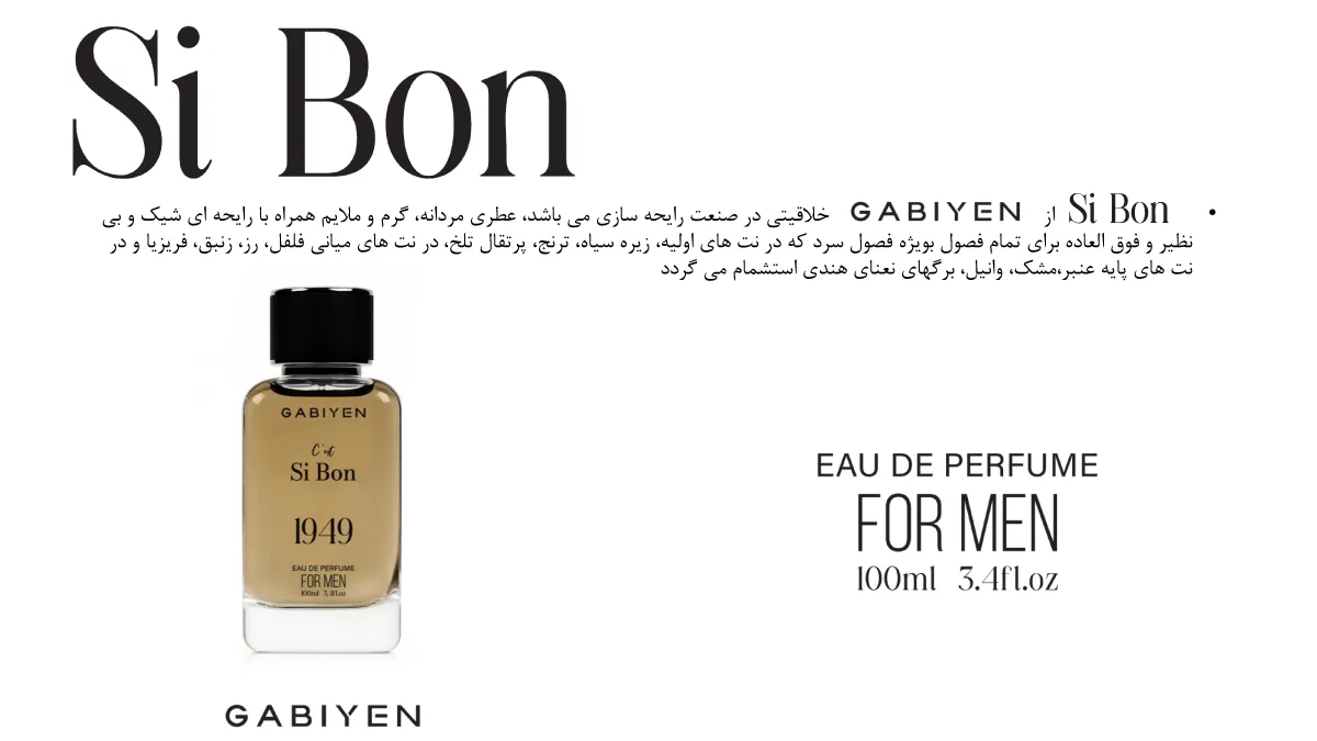 بوی SIBON از Gabyien خلاقیتی در صنعت رایحه سازی می باشد، عطری مردانه، گرم و ملایم همراه با رایحه ای شیکو بی نظیر و فوق العاده برای تمام فصول بویژه فصول سرد که در نت های اولیه، زیره سیاه، ترنج، پرتقال تلخ، در نت های میانی فلفل، رز، زنبق، فریزیا و در نت های پایه عنبر،مشک، وانیل، برگهای نعنای هندی استشمام می گردد.